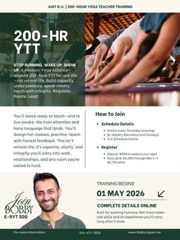 A modern, Yoga Alliance–aligned 200-hour YTT built for real life—not retreat life. You’ll train attention, calm your nervous system under pressure, and learn plain-language cueing that lands. We’ll design full classes, practice-teach with honest feedback, and build a Modern Ethics Charter so tech becomes a tool, not a trap. Leave with capacity, clarity, and integrity you can carry into work, relationships, and any room you’re called to hold.